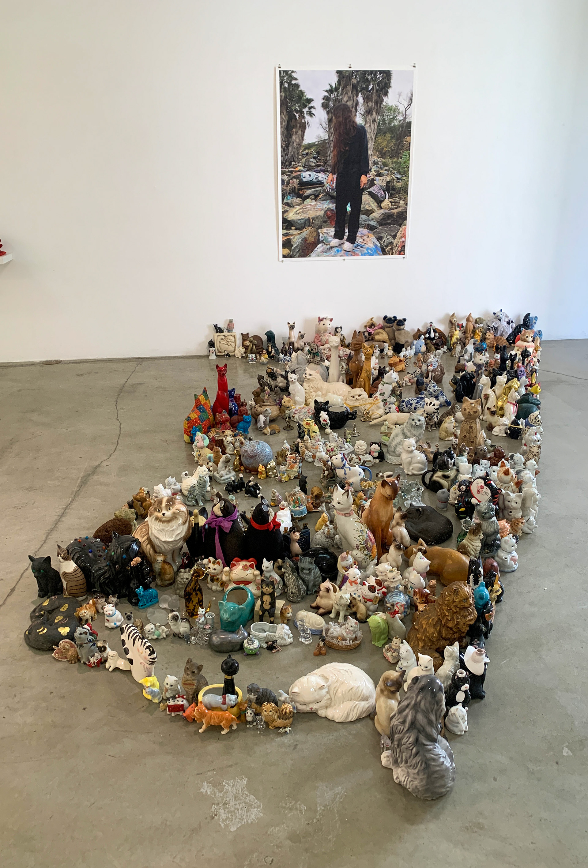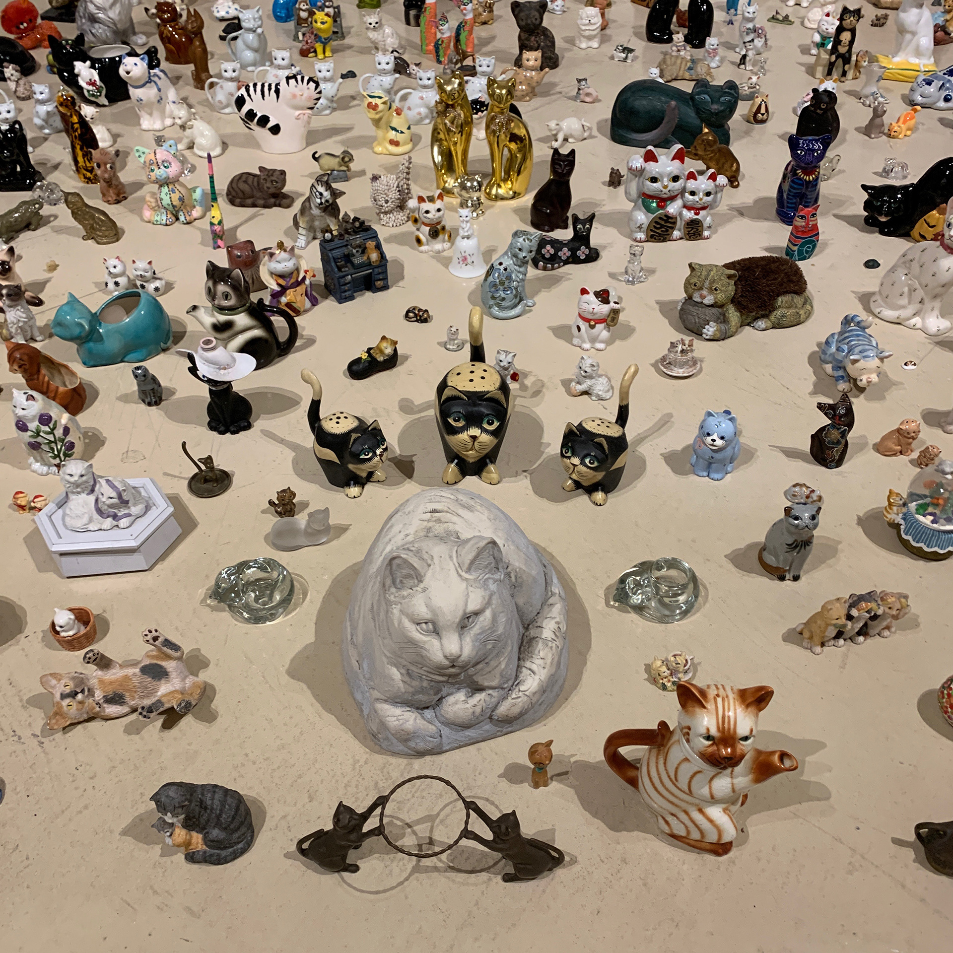 Collected cat figurines, 2019-ongoing, Dimensions variable with I Rang A Silent Bell, Archival pigment print, 2019, 44 x 56 inches