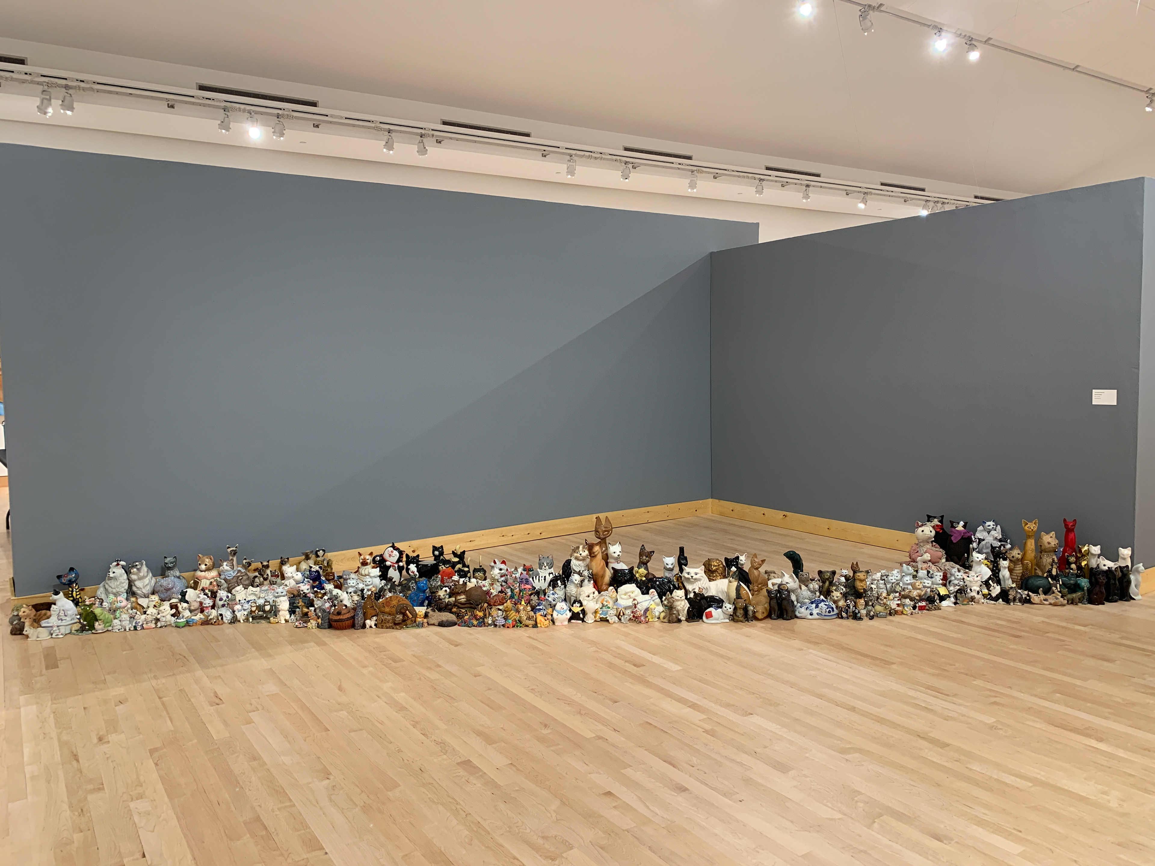 The installation also suggests the multilayered term “pussy,” which, like the cat lady, has a long linguistic tradition. The word, as used to describe a cat, originated in the sixteenth century, and in the seventeenth century came to refer to girls or women. “Pussy” was first used to indicate the vagina in the eighteenth century, while later coming to imply weakness. Today, depending on the intention of its usage, the term oscillates between demeaning and empowering, erotic and political. In Salcido Whitmore’s installation, pussies dominate the space as she both humorously embraces and critiques the cultural meaning of her found materials. She transforms the figurines by placing them in the fine art gallery, where they wield power over the viewer with their abundant presence.