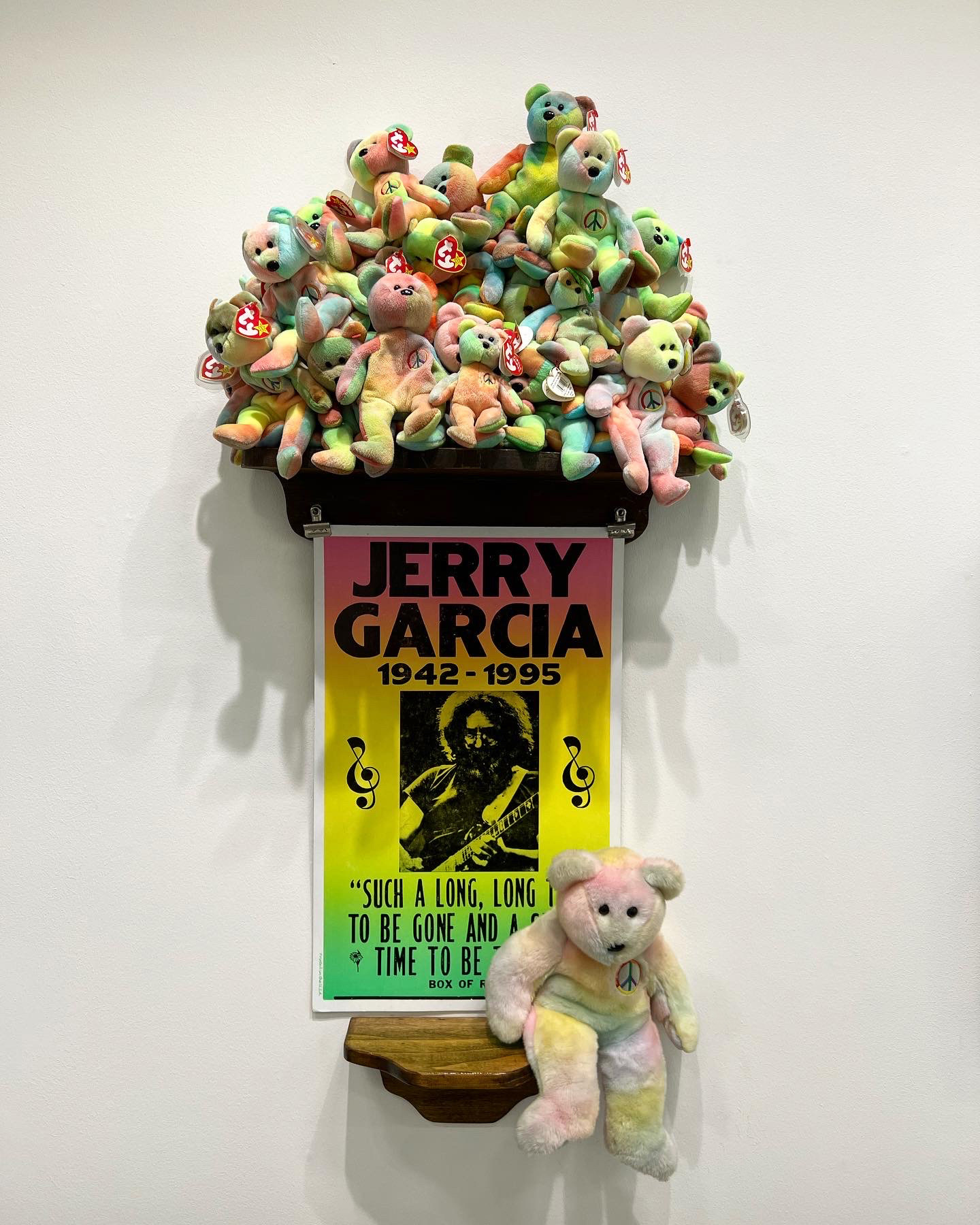 TY peace bear beanie babies, ty garcia the bear beanie baby, wood shelves, metal clips, and Jerry garcia poster